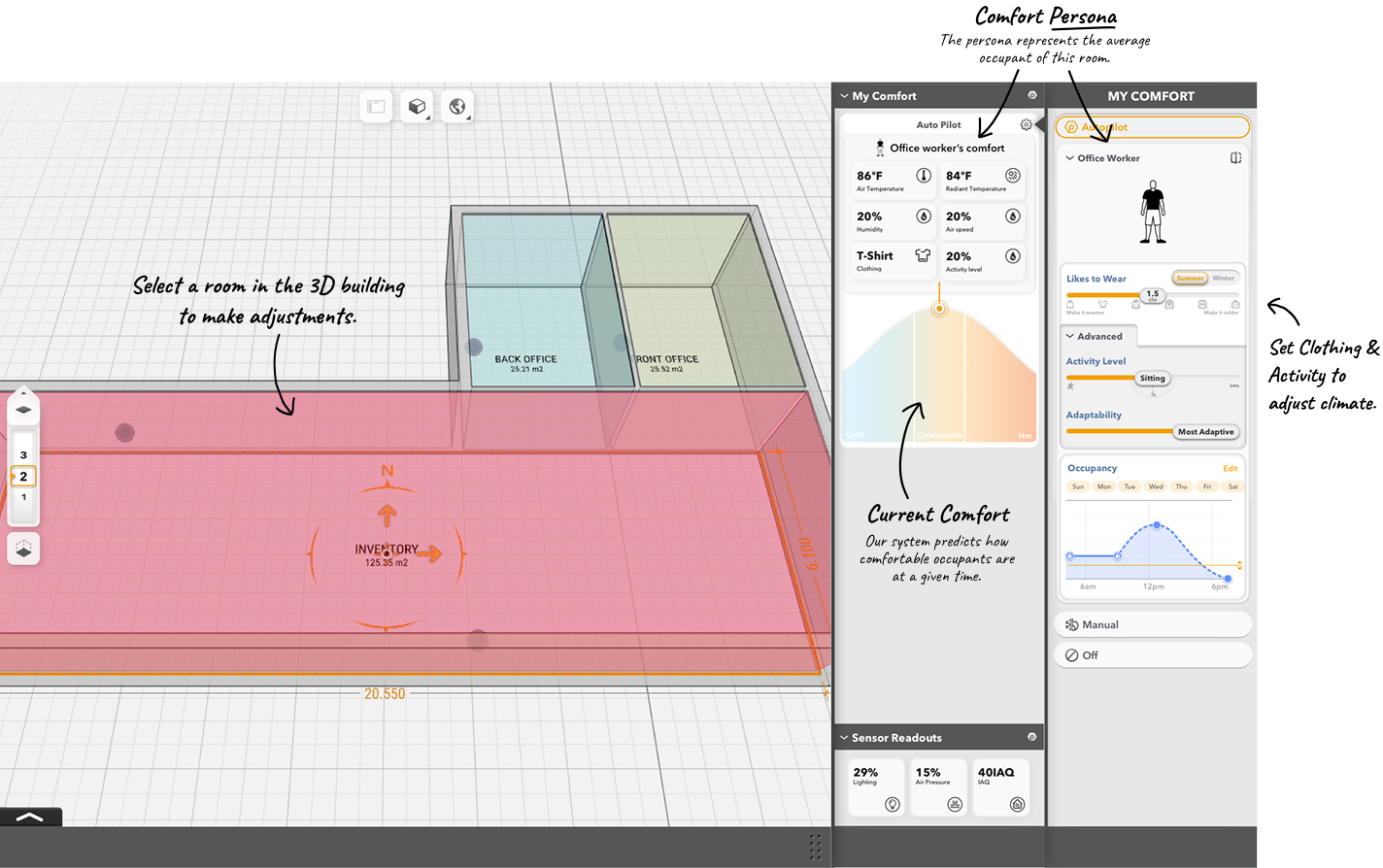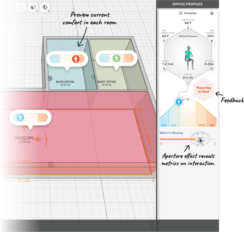 of your building. They have a clothing setting and an activity setting, both of which effect how comfortable a person would be in a particular environment. Users can use preset personas, make custom adjustments and effectively control multiple climate zones in one place.