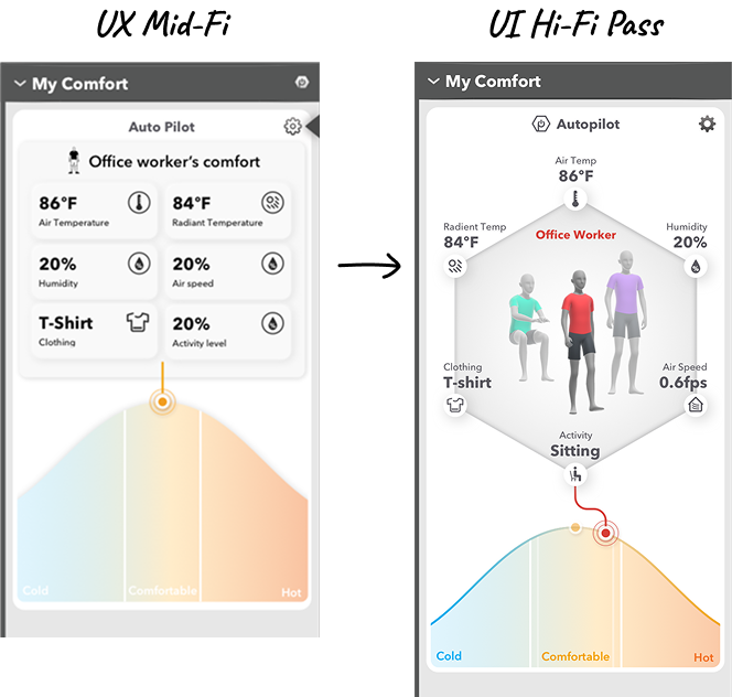 Our users complained they weren't sure changing the clothing slider was having an effect. Understandable, because the HVAC system may choose to not turn on immediately in response to the change. We added a "preparing to heat/cool" indicator when the user moves the slider.
